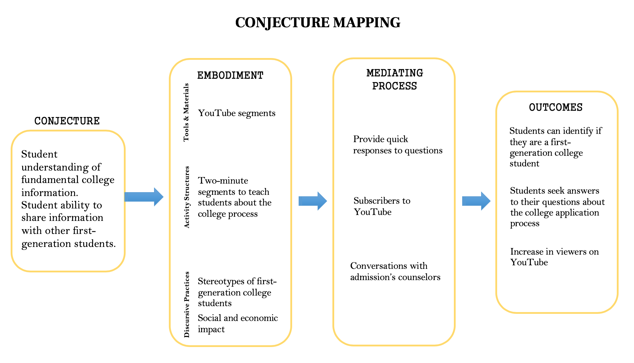 For children who are the first from their families to attend college – any college – the path is a very different one than those who have others in their families who have made that journey (IDRA, 2012). Access to technology allows students to get information related to any topic of interest quickly. Guidance through a YouTube Channel for first-generation college students provides insight into the college experience and addresses the essential skills prior to the student starting college and throughout the college experience.